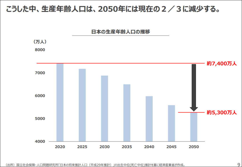 2020年、7400万人いる生産年齢人口は、2020年には5300万人へ減少するようです。