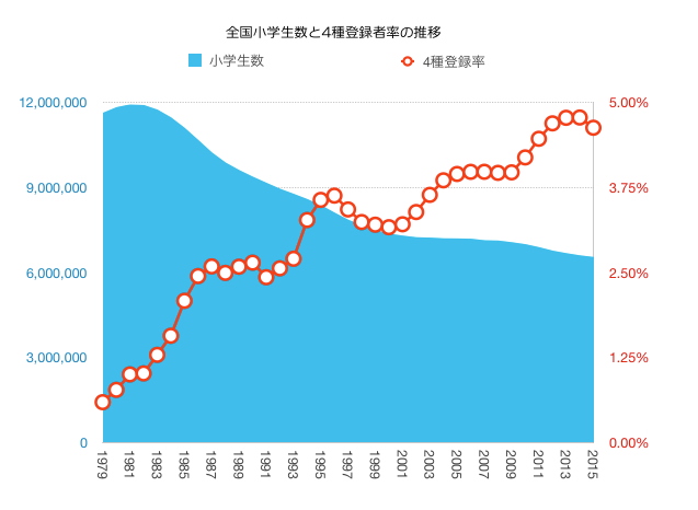 JFAのデータが1979年以降なので、それに合わせて小学生数も調べてみました。まず、小学生数は1981年の約1,200万人弱をピークに減少傾向となっています。2015年が約650万人なのでピーク時の半分近くまで減ってる事になります。