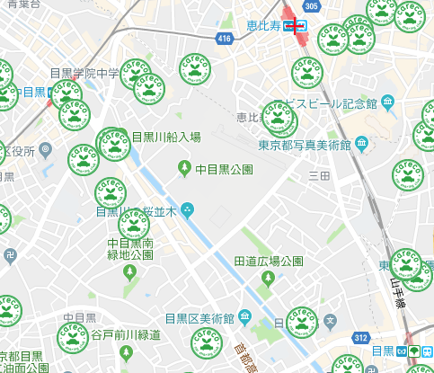 近くに多いのは「タイムズカープラス」「カレコ」ですね。歩いて15分圏内に中目黒・恵比寿・目黒駅があるので、エリアとしては下記のような感じでしょうか。