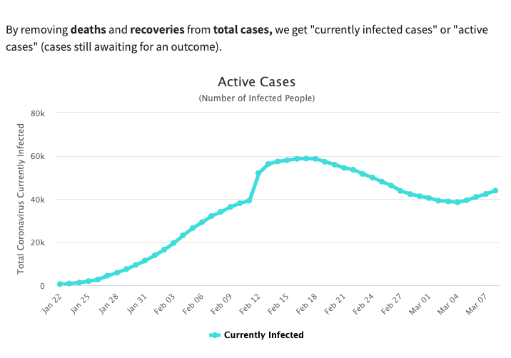 実は、この人数は回復者数が考慮されてないんです。回復後に、再度発症するケースもあるので何とも言えないですが、実は回復者数(死亡した人の数も)差し引いた人数では、一時期より減ってます。