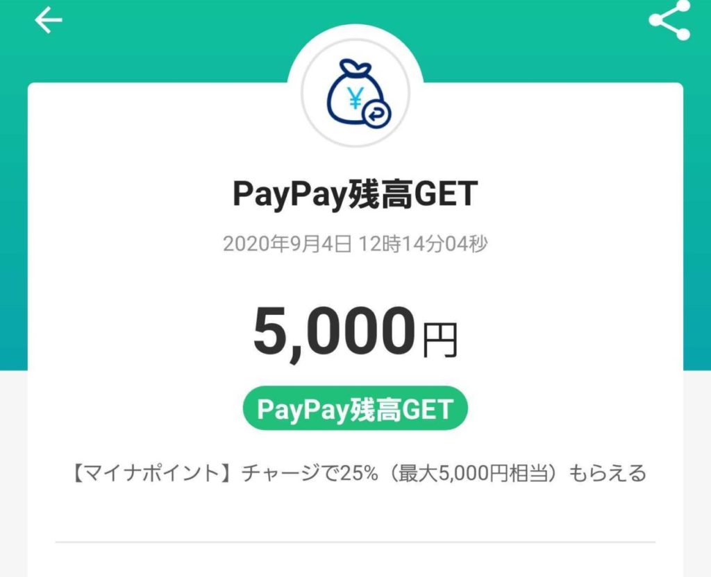 それと比べるとPayPayは単純です。2万円チャージすれば5千円分付与されます。